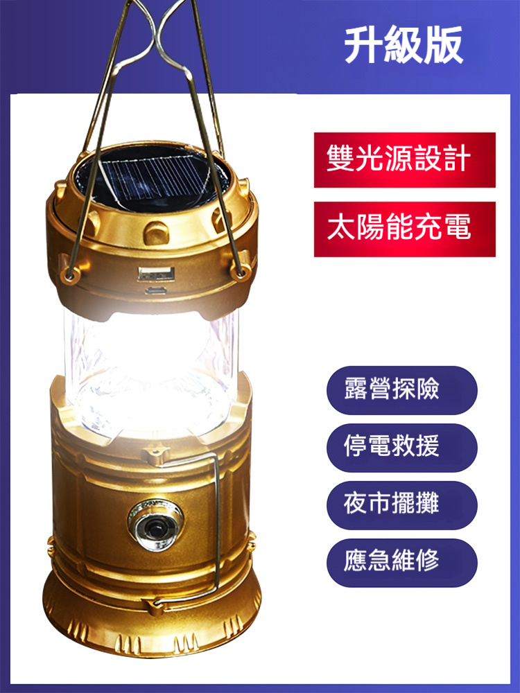 【一燈四用·能源自給】太陽能露營燈|伸縮變形照明+USB手機充電,有光就有電,戶外行動電源與照明一次搞定
